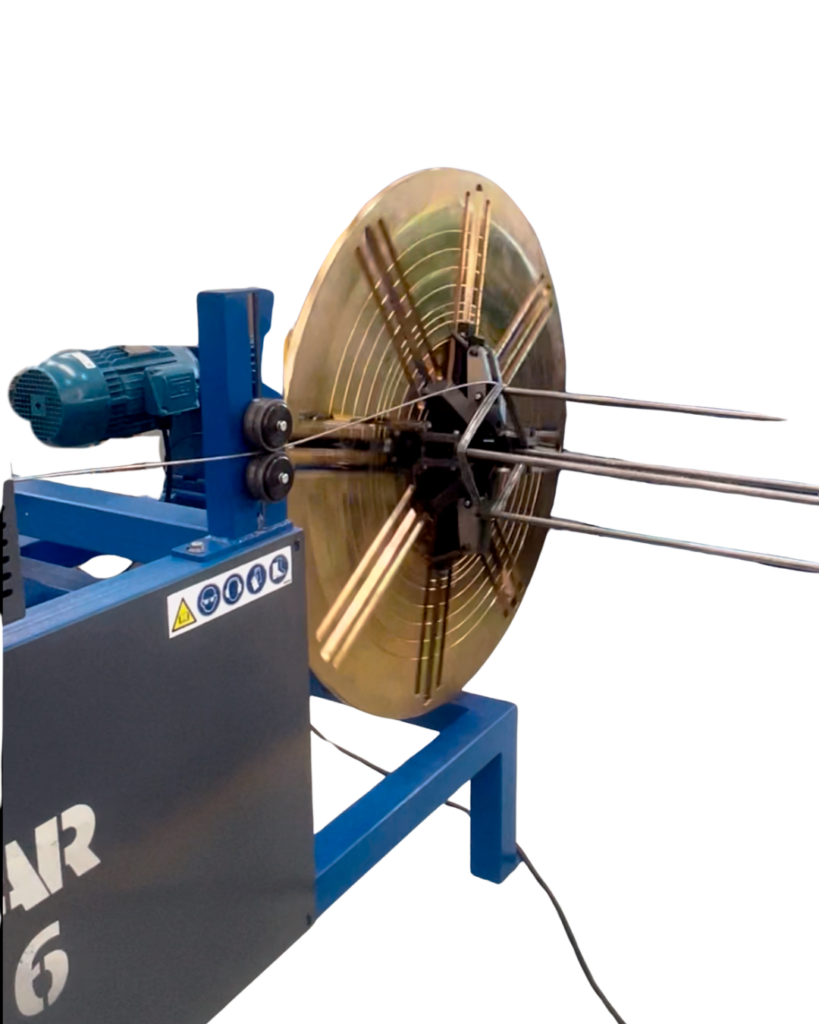 Maquina automática para conformação de estribos espiral quadrado unidirecional nas bitolas de 3,4 e 4,2 mm CA 60. Equipada com sistema de arraste através de motor/redutor. Sua programação é através de contador de voltas permitindo assim o número de espirais de acordo com a necessidade.