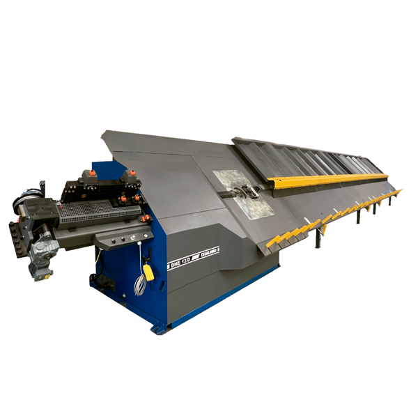 Estribadeira automática para conformação de estribos, barras retas ou traves com dobras nas duas extremidades, sentido de dobra bidirecional nas bitolas de 4,2 a 12,7 mm CA 50. Equipada com sistema de arraste duplo e cabeçote de dobra único com servomotor em todos os eixos principais e corte elétrico. Programação por tela touch 10″ e controle numérico multieixos eletrônico.
